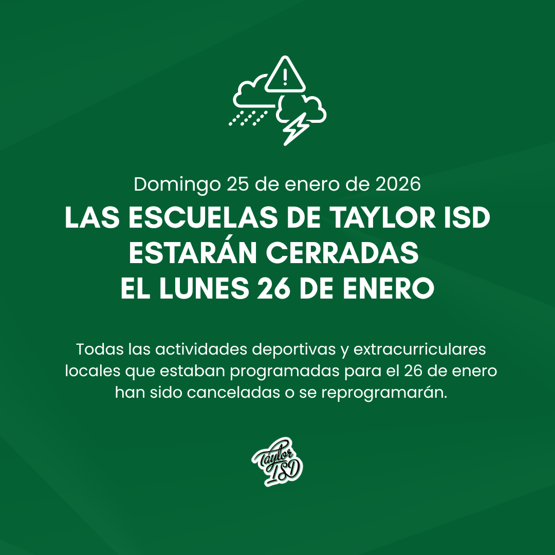 Announcement: All Taylor ISD schools are closed on Monday, Jan. 26, 2026, due to weather.
